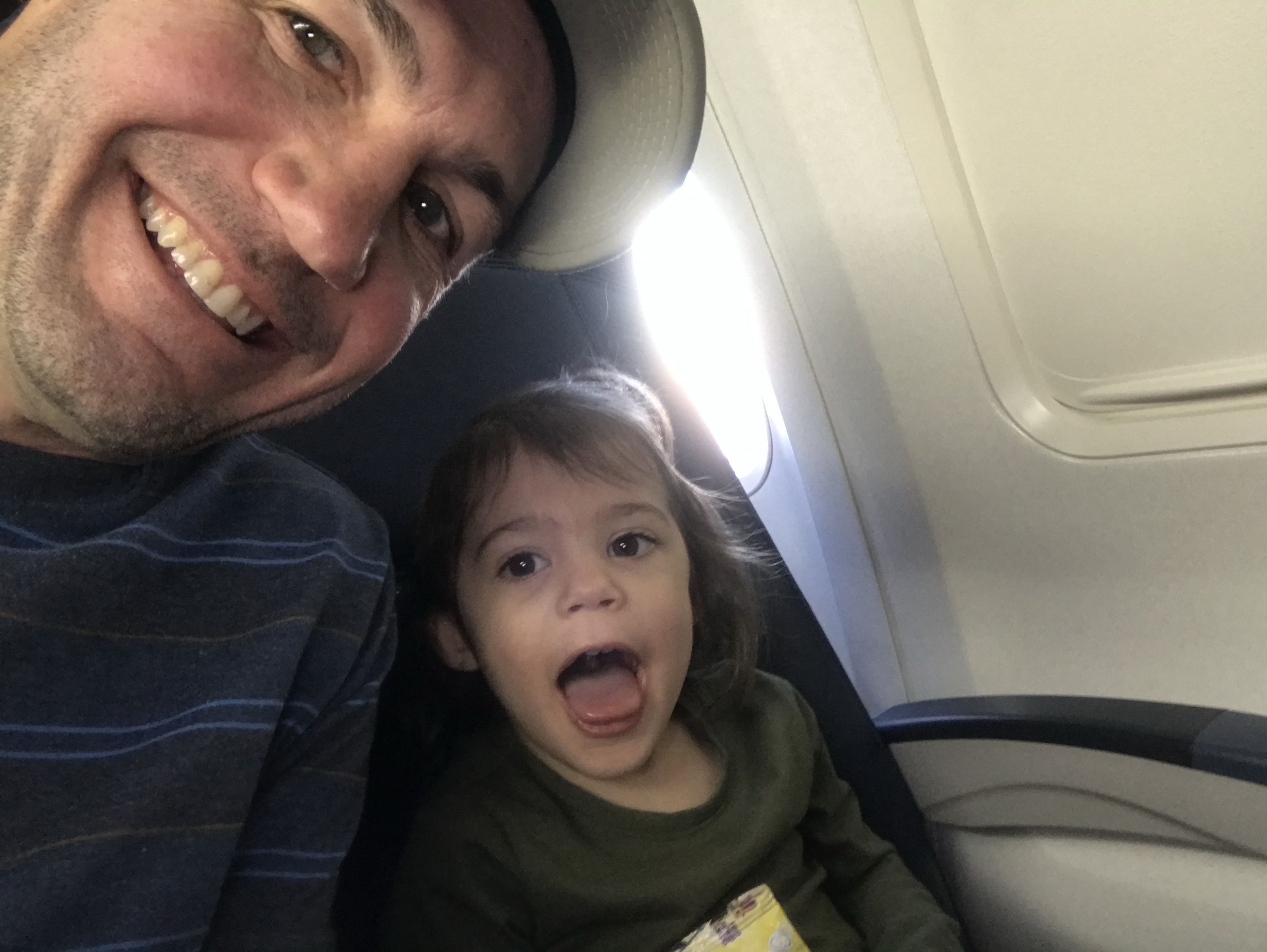 G and Dad on the plane, 3 rows behind us.