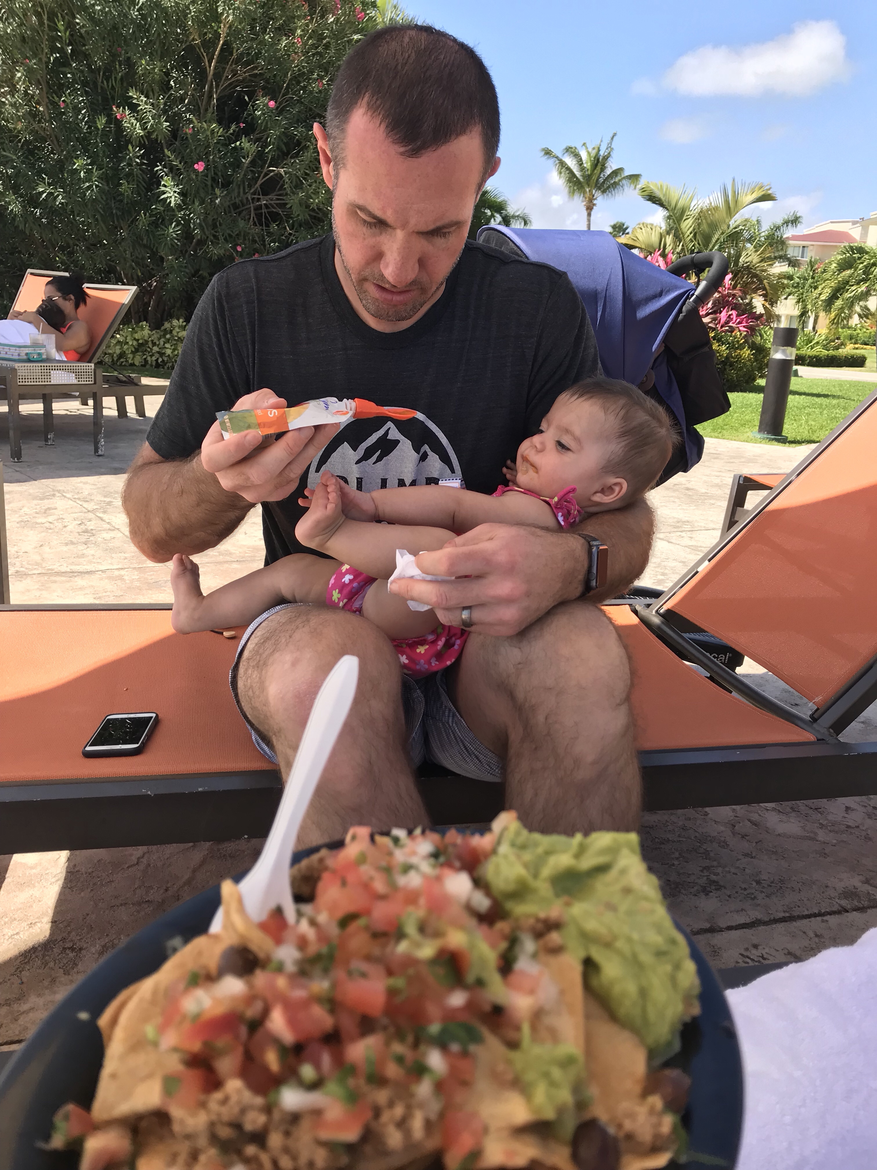 Nachos for us, pureed mangos for G
